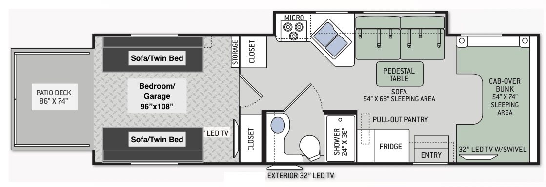 - External storage: 17.2 cubic feet and over 400 cubic ft of storage by using back bedroom/garage with access ramp!